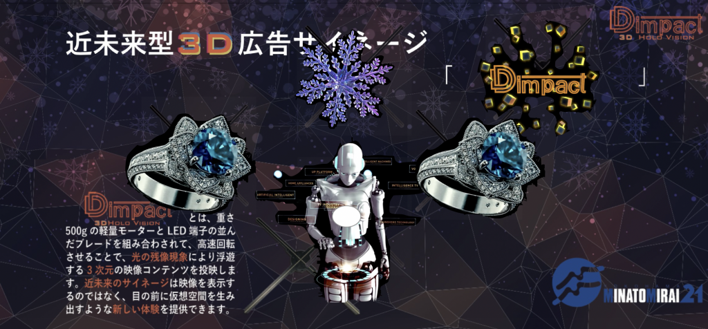 株式会社Drootsは、一般社団法人横浜みなとみらい21、クイーンズスクエア横浜にて近未来型広告として、弊社のLED回転式ホログラムディスプレイ「Dimpact 3D Holo Vision」を使用したホログラム 広告を2019年12月28日より開始致しました。
